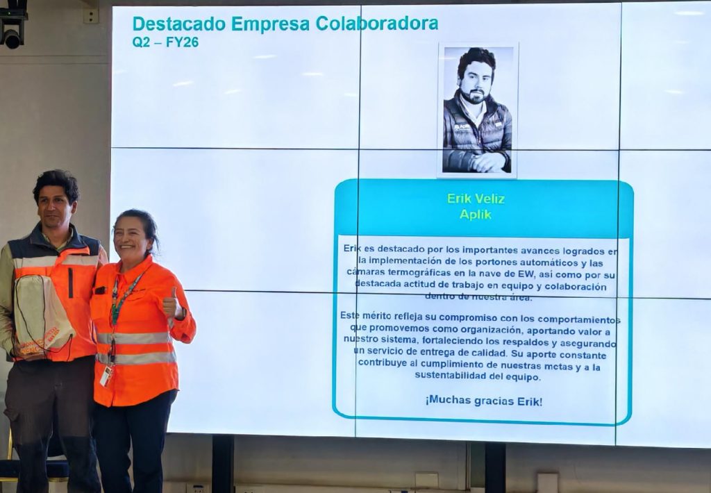 En APLIK destacamos a Erick Veliz, reconocido por BHP por los avances alcanzados en la implementación de portones automáticos y sistemas de cámaras termográficas en la nave EW, contribuyendo a mejorar la seguridad y eficiencia operativa.